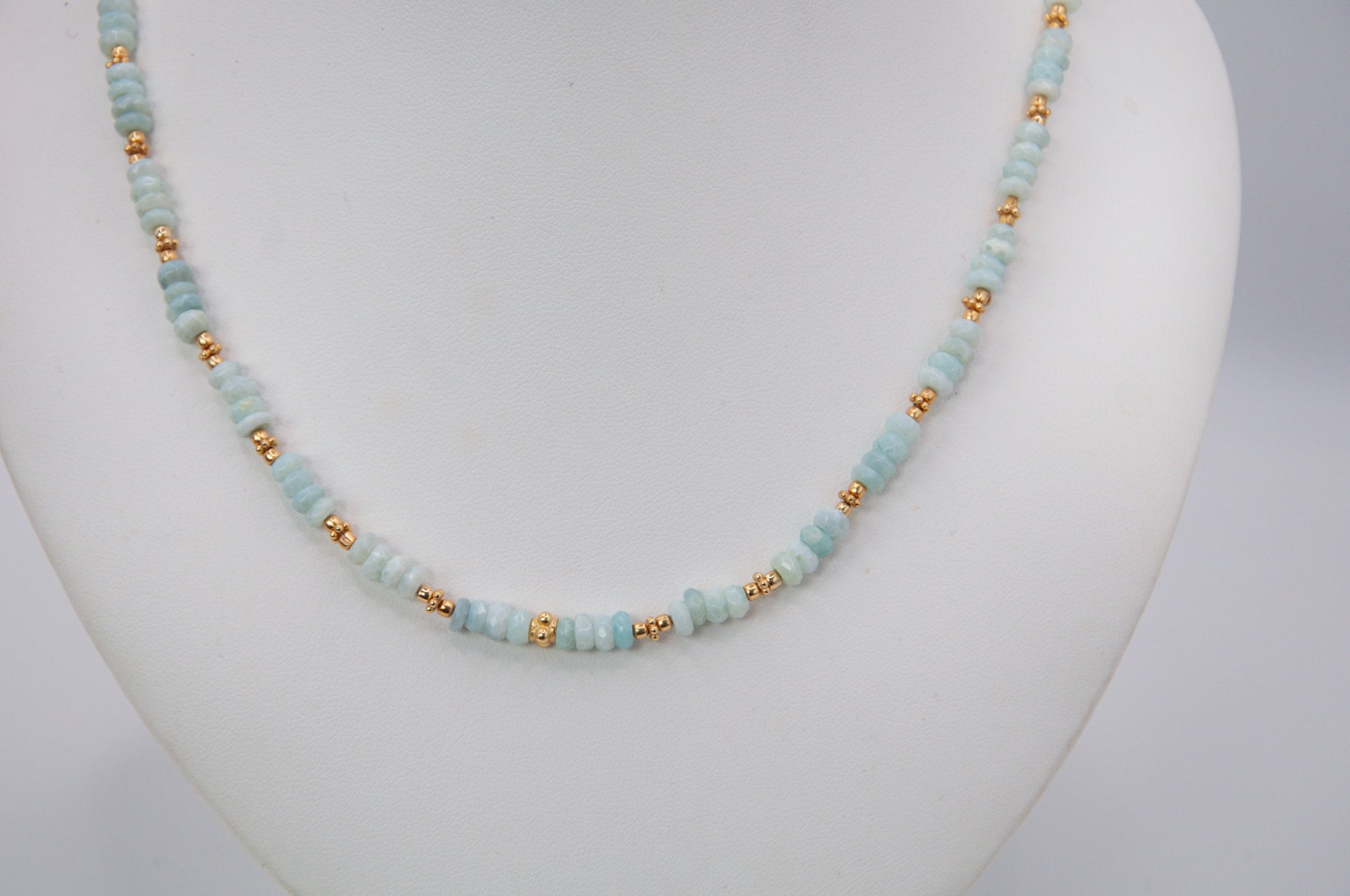Turquoise Peruvian opals are interspersed with handmade 18k gold plated silver beads.