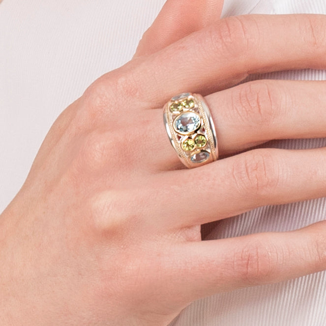 Blue Topaz and Peridot Sterling Silver & 14ct Gold Vermeil Seven Stone Ring - 091