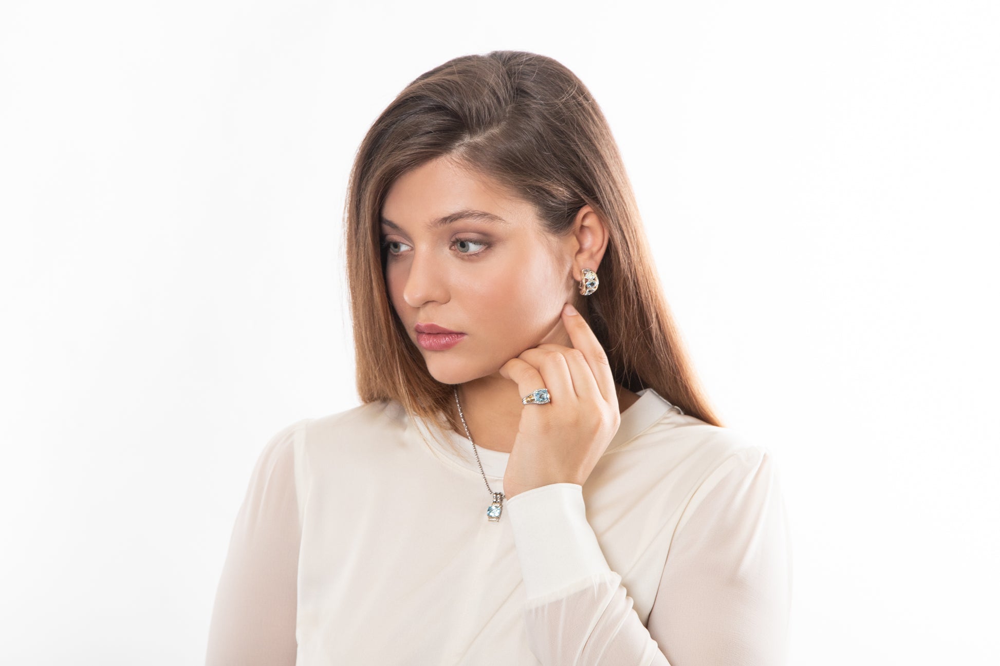 The Blue Topaz stone is approx. 10mm in length and 8mm in width and surrounded by White Sapphires.