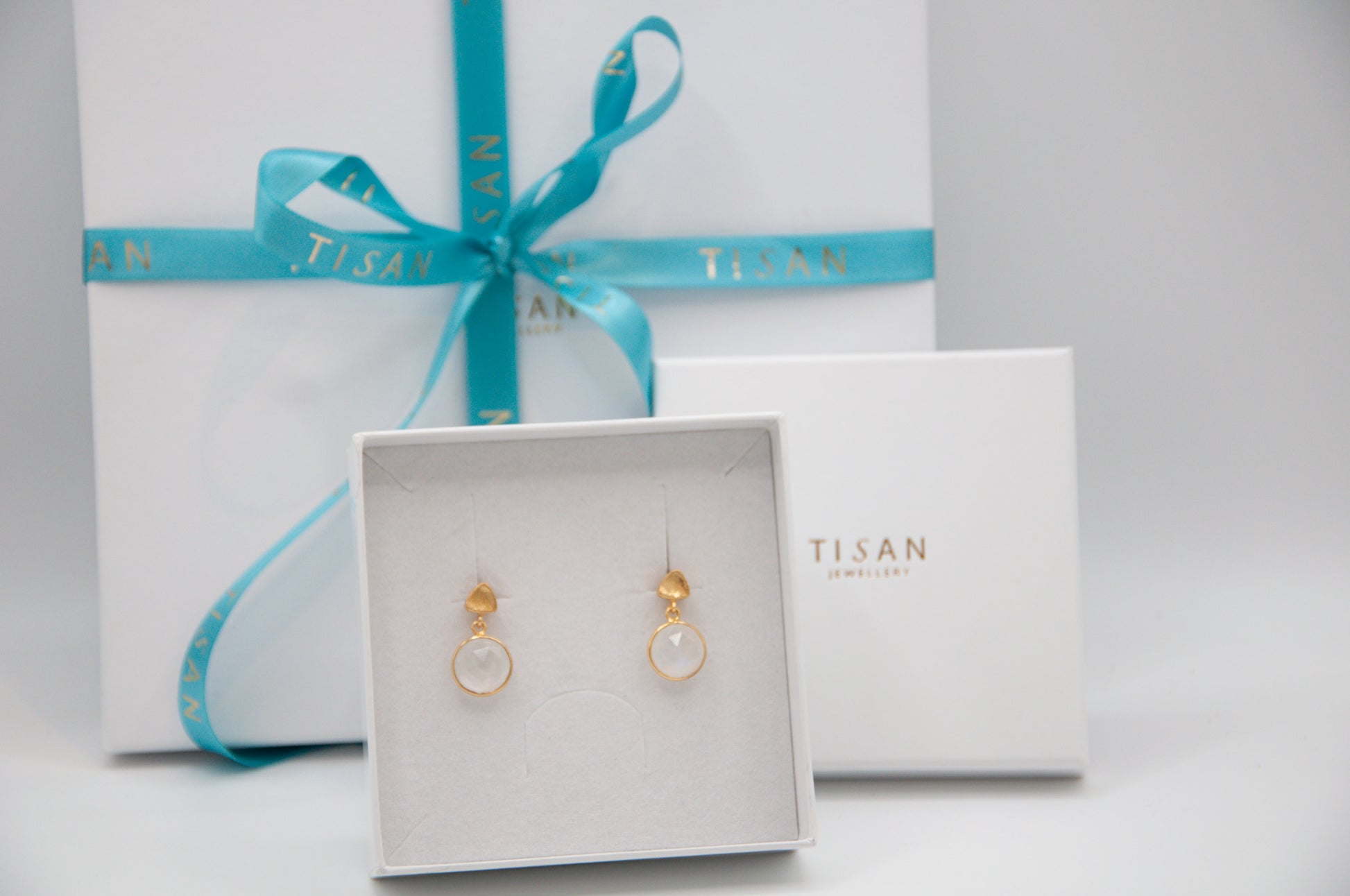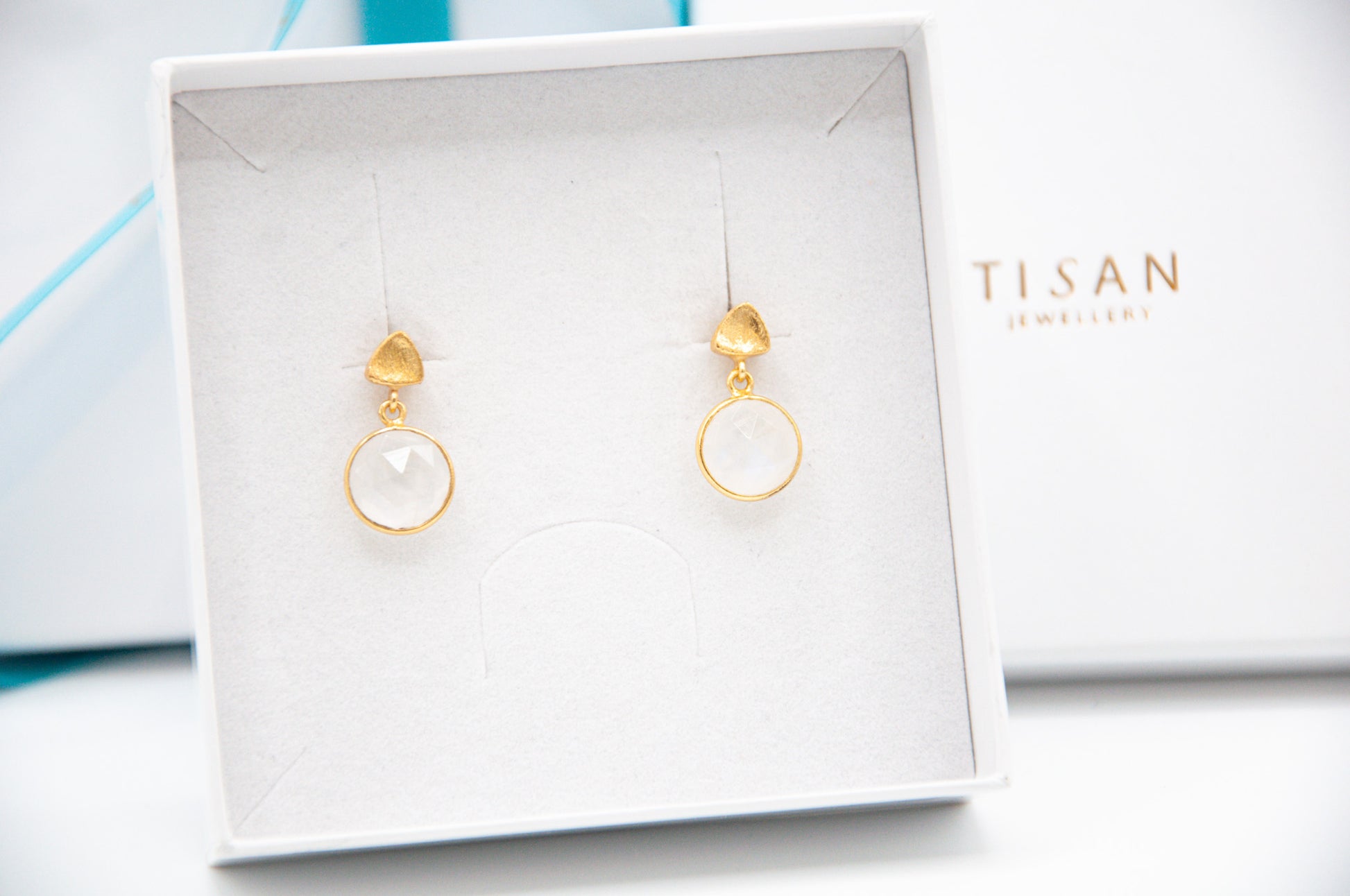 Faceted semi-precious stones set in a simple gold vermeil setting hang from a geometric, brushed 18k gold plated silver stud fitting.