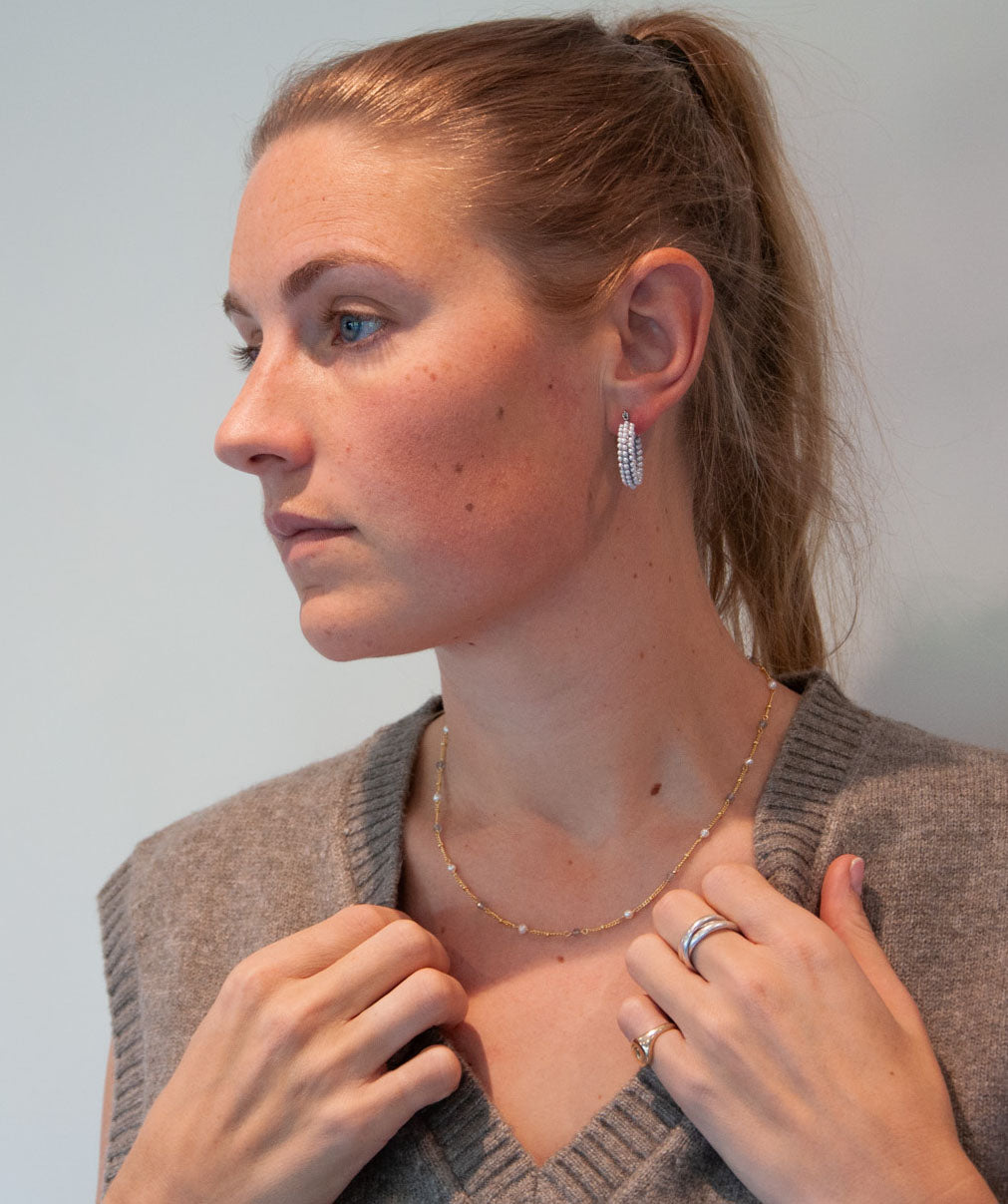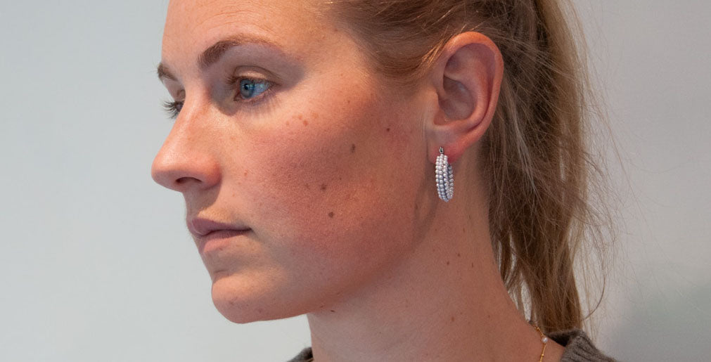 Stunning chunky hoops covered with tiny mother of pearl beads. The perfect hoops for day or night, any occasion and any time of year. These will be your new go-to earrings to complete your outfit. Modern pearls for the every day!