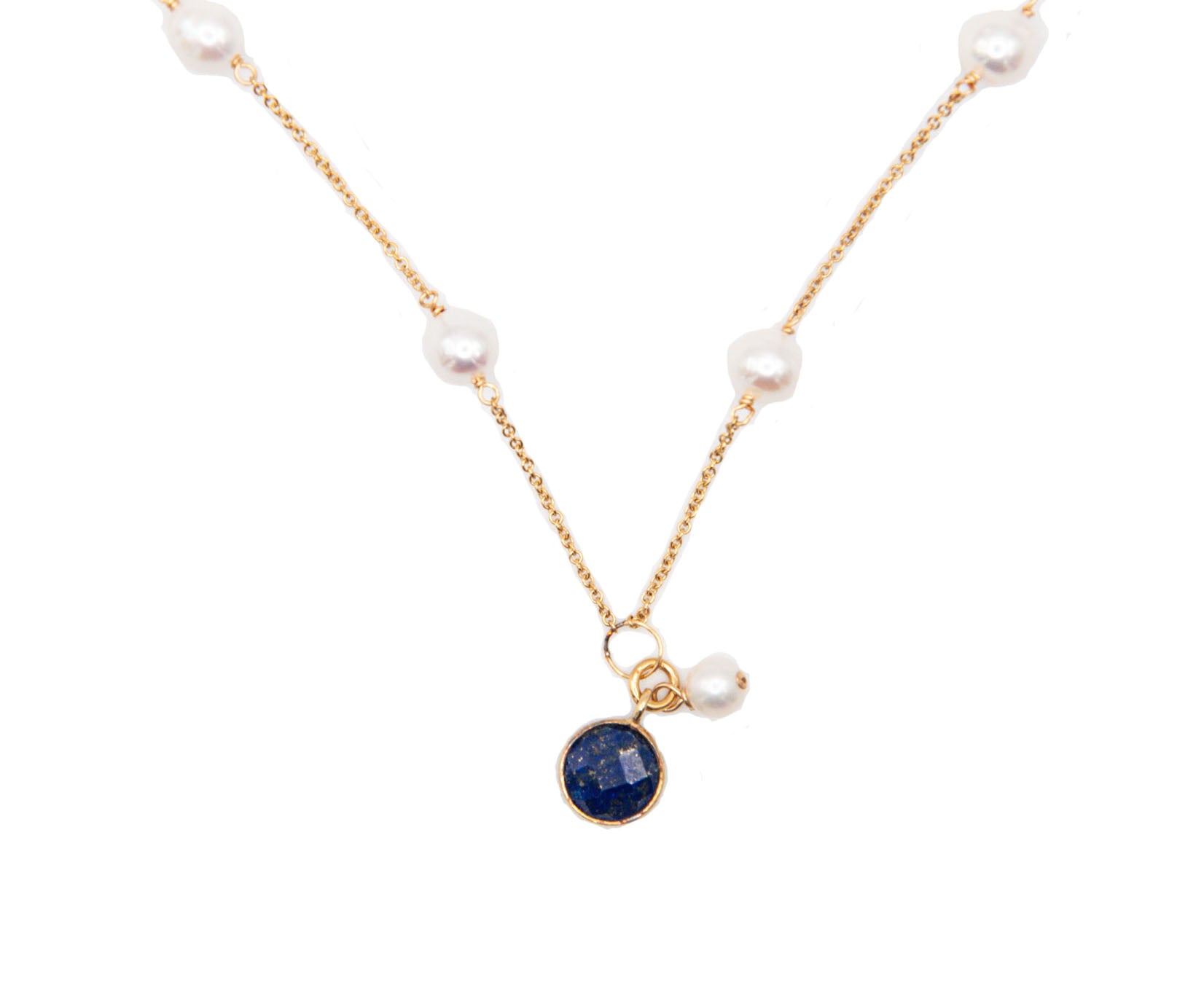 A delicate cultured freshwater pearl fine chain necklace with a modern twist. This elegant necklace combines almost round cultured freshwater pearls with a round lapis lazuli drop to create a stunning piece to be worn day or night.