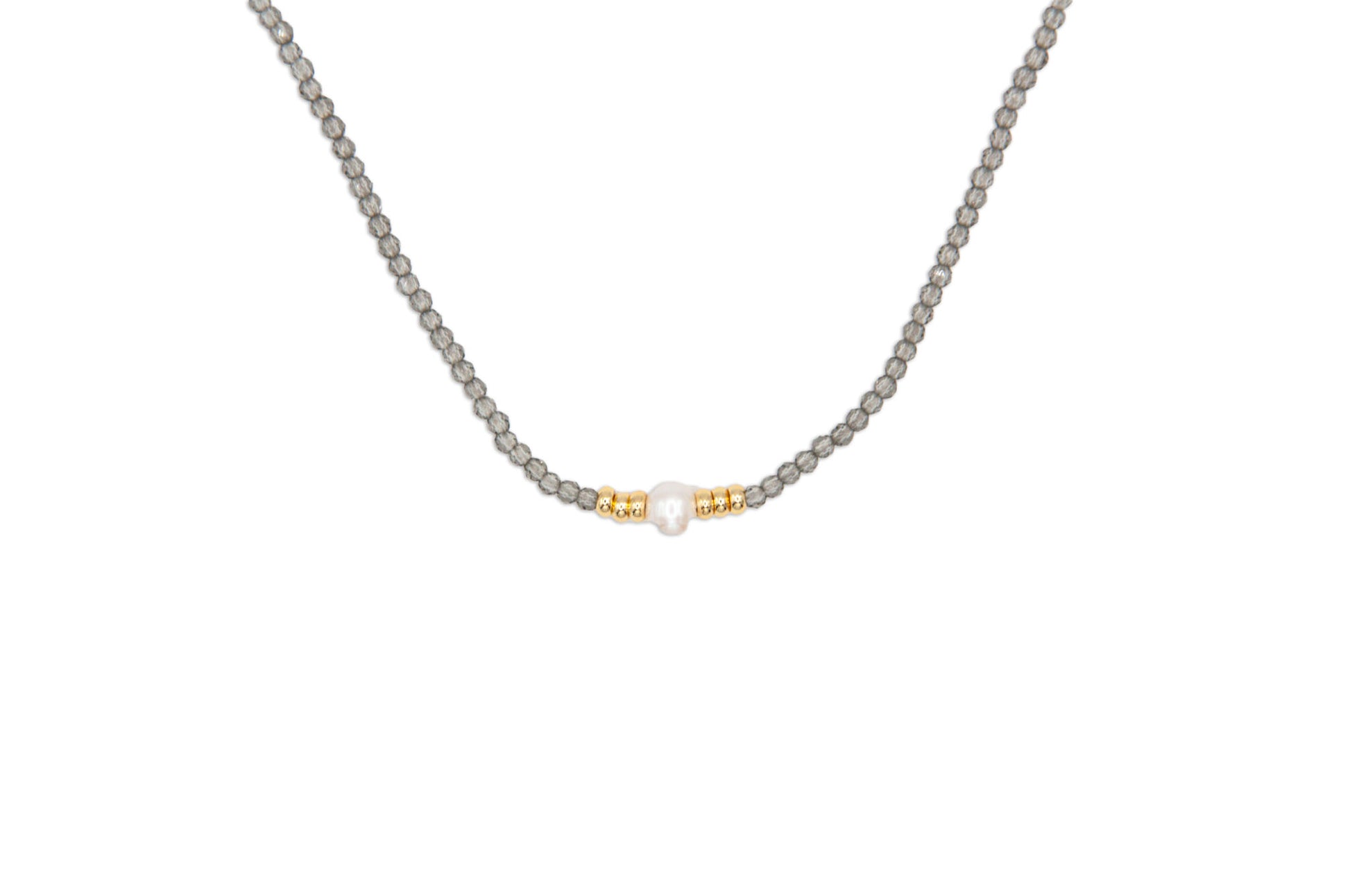 A delicate and stylish grey spinel necklace with small cultured freshwater pearl in the centre. This gorgeous necklace can be worn solo or paired with with chains or pearls for ultimate impact.