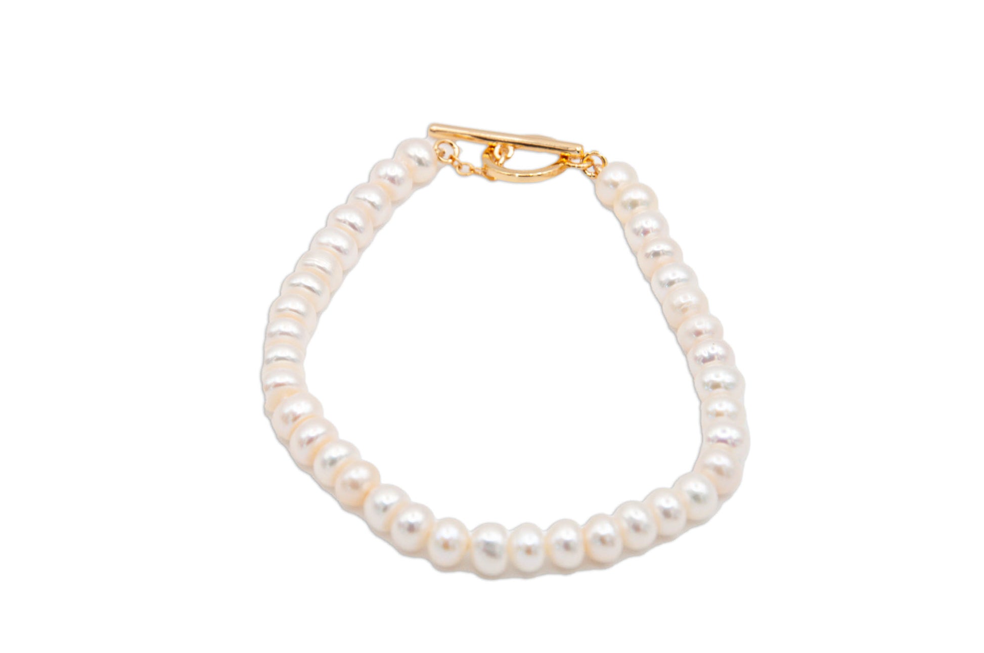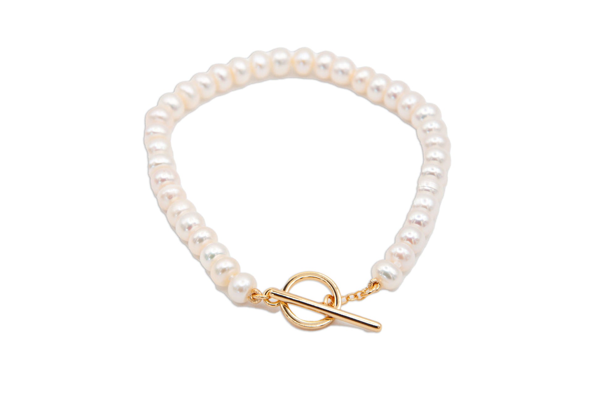 This bracelet is essential for anyone who loves pearls. Featuring button-shaped white cultured freshwater pearls and a simple gold plate toggle clasp, it's effortless to wear. A must for your jewellery collection!