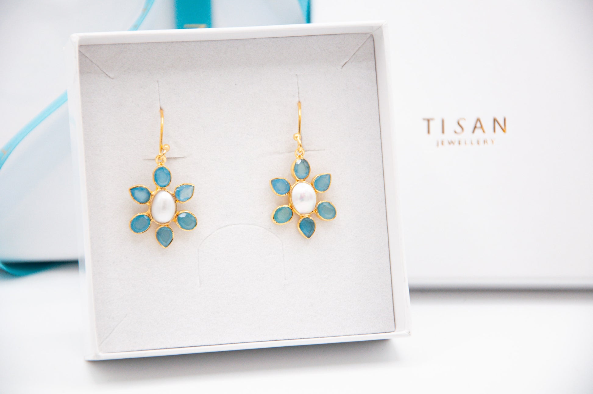 Our pretty gemstone flower earrings feature natural freshwater pearls and faceted blue chalcedony gemstones. Subtle and playful floral drop earrings with a simple hook fitting - easy to dress up or down.