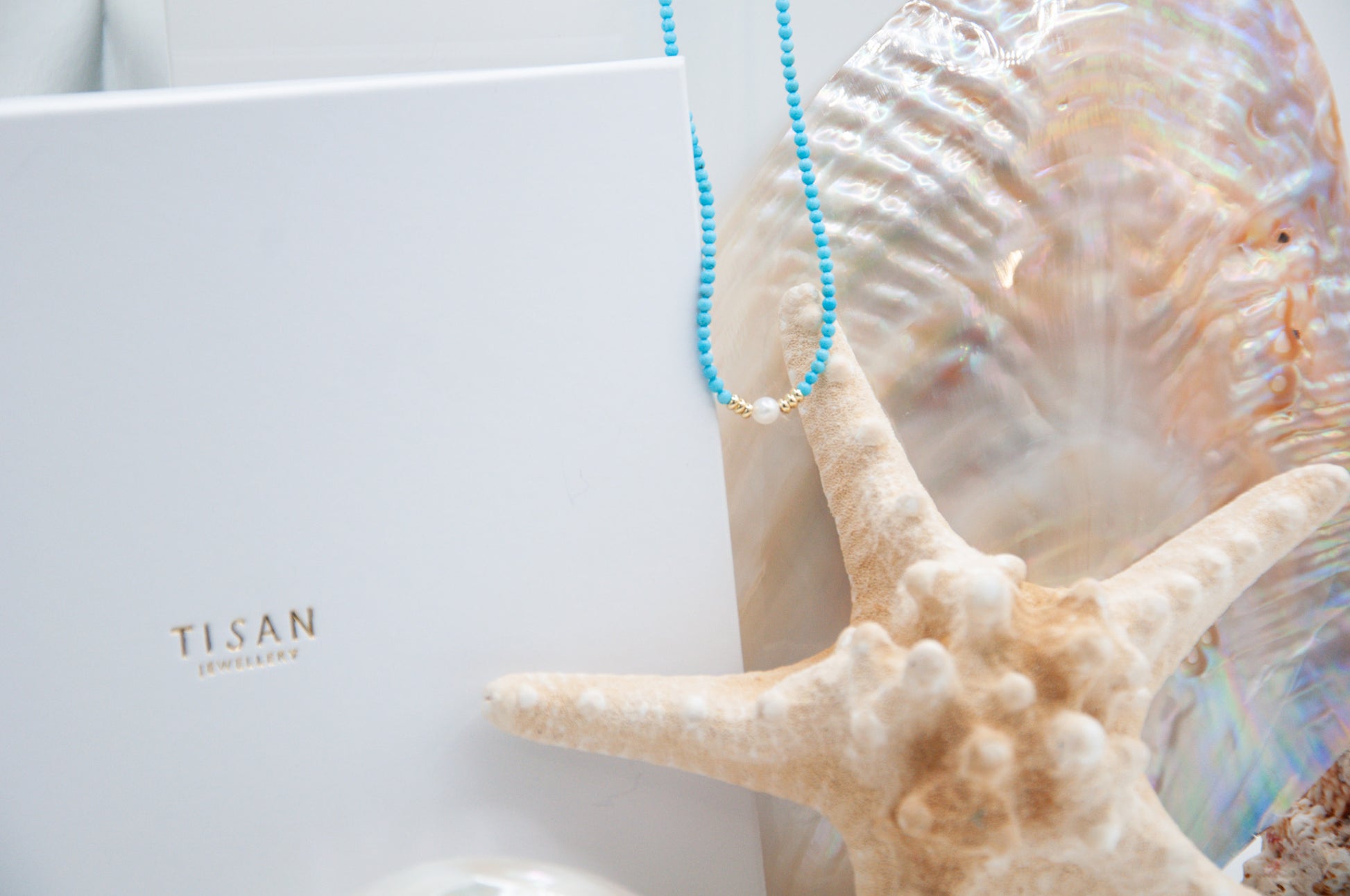 A delicate but vibrant dyed turquoise necklace with small cultured freshwater pearl in the centre. This fun and fabulous necklace is stunning worn on its own or layered with your other chains or pearls. An essential pop of colour for your wardrobe and a must for the summertime.